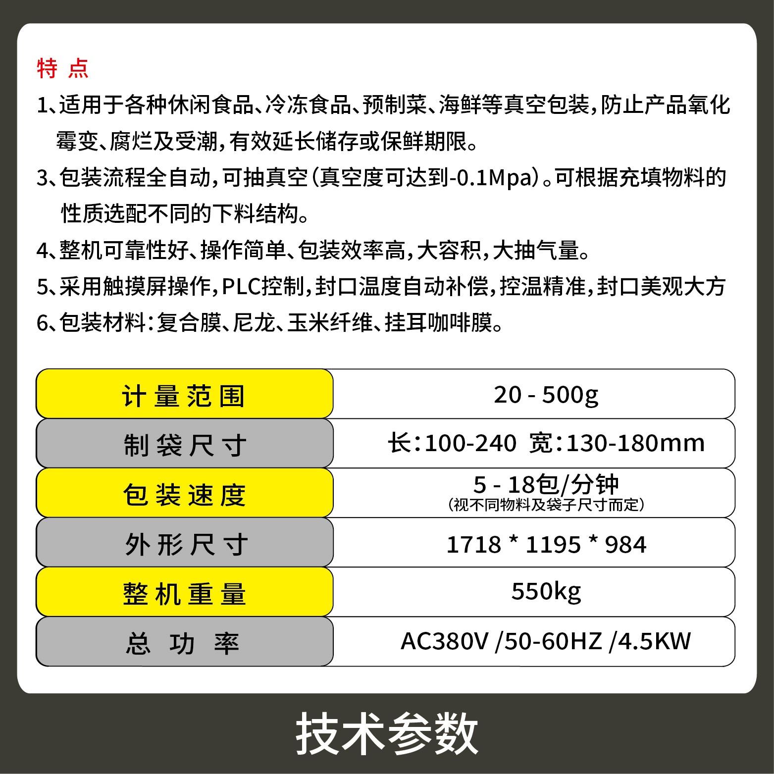2、包裝流程全自動,可抽真空(真空度可達(dá)到-0.1Mpa)??筛鶕?jù)充填物料的性質(zhì)選配不同的下料結(jié)構(gòu)。