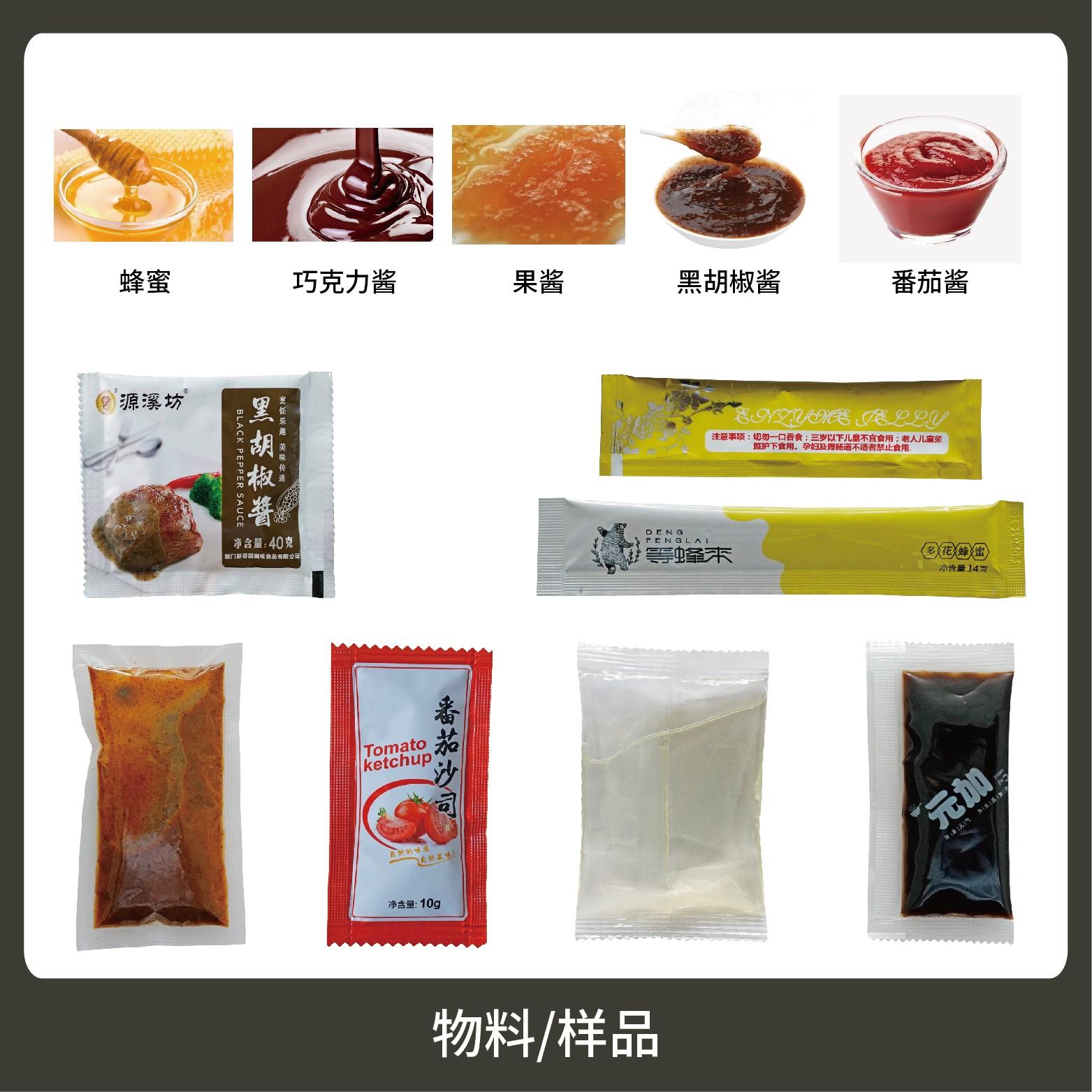 適用于食品、醫(yī)藥、化工、化妝品行業(yè)中液體、醬料物品的計量包裝,如:番茄醬、辣椒醬、黑胡椒醬、貓條等。